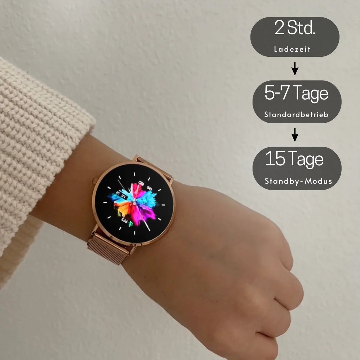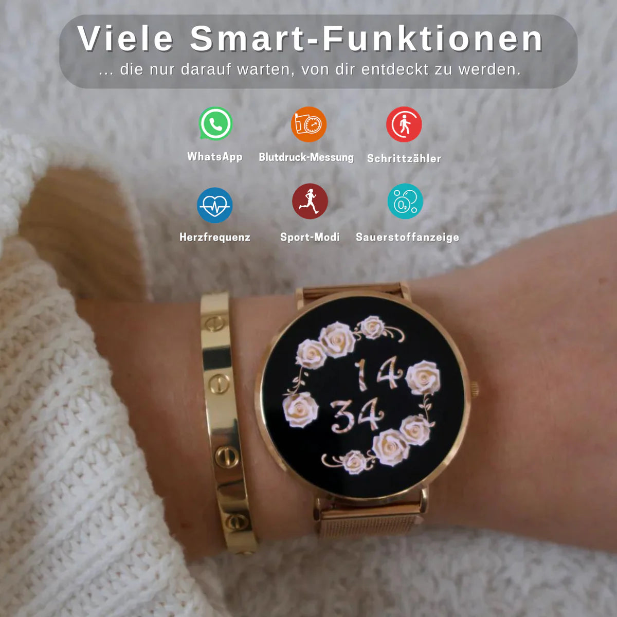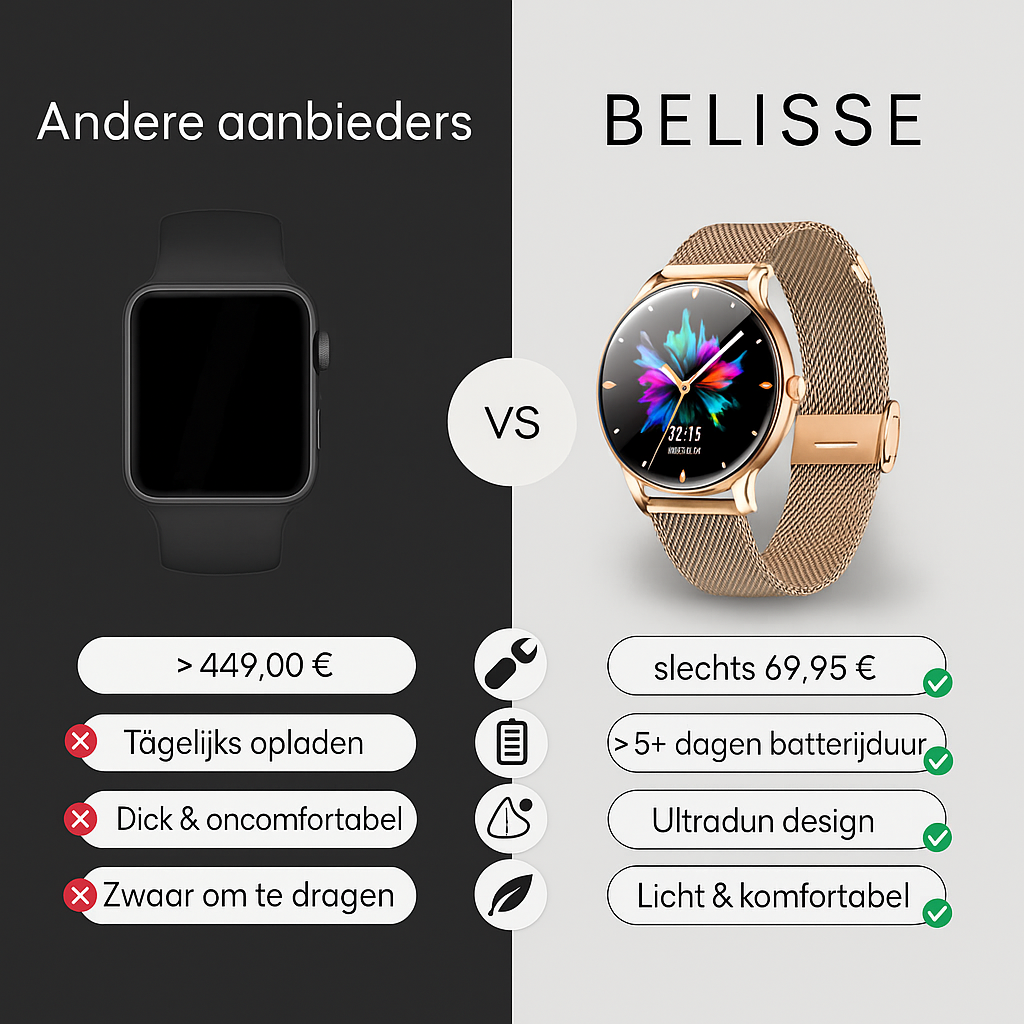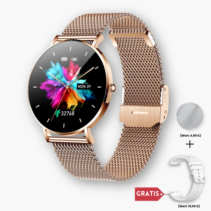 Dankzij het modieuze design past de Belisse Smartwatch perfect bij al uw outfits: als stijlvol accessoire bij een zakelijke look, gecombineerd met een eenvoudig T-shirt of als aanvulling op een elegante jurk. Je benadrukt altijd je eigen stijl en je kunt er zeker van zijn dat je liefdevolle complimenten krijgt.