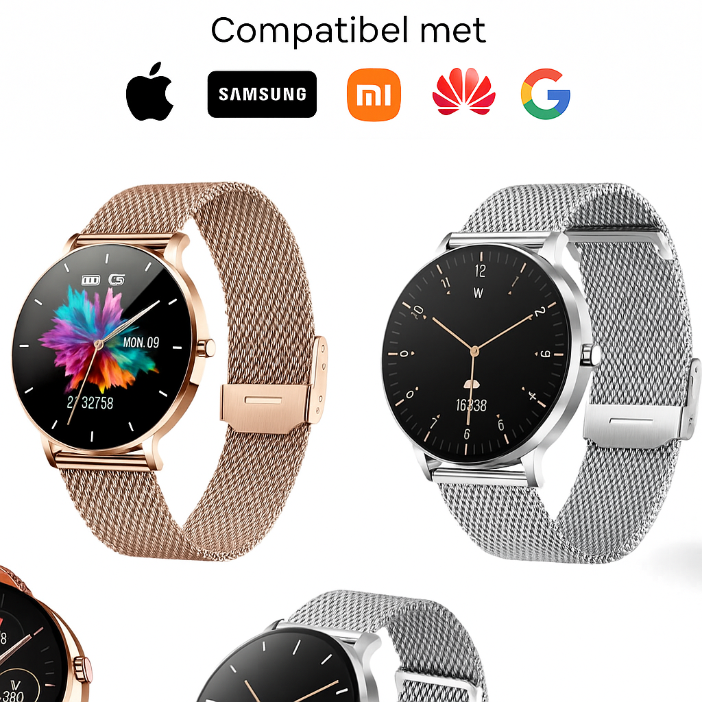 De SmartWatch is compatibel met verschillende mobiele telefoonmerken, zoals Apple, Samsung, Xiaomi en Huawei . Verbind uw smartwatch eenvoudig met uw smartphone en ervaar het volledige aanbod van 30 beschikbare apps en functies.